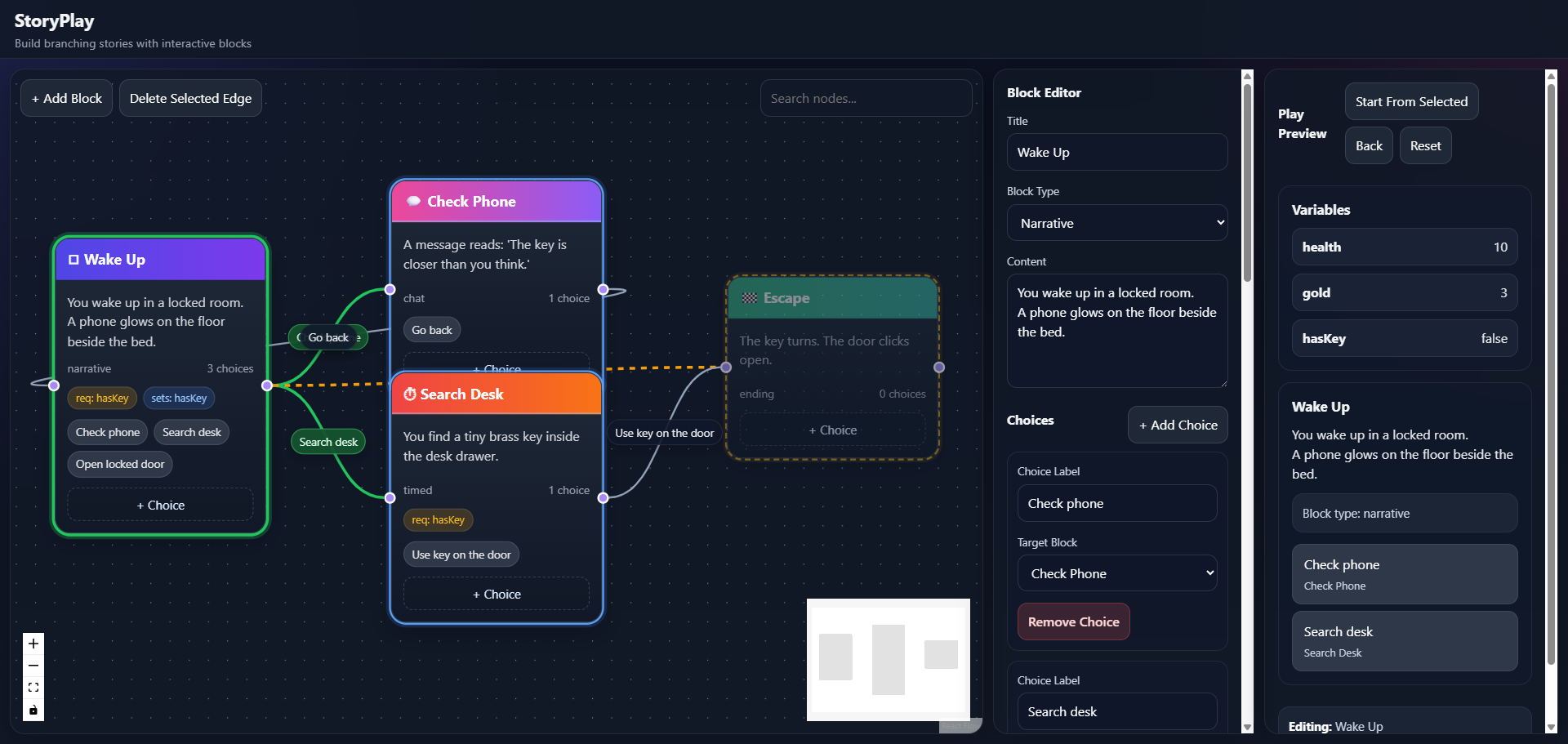StoryPlay is a Twine-inspired visual story builder for creating branching interactive fiction using a node-based editor, playable preview mode, variables, conditions, and choice-driven game logic.